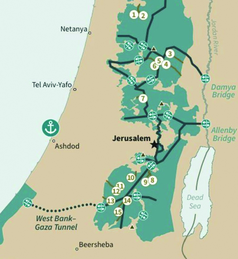 The conceptual map shows these 15 towns completely cut off from each other, and each one accessing the rest of Israel via single, narrow corridors completely surrounded by the proposed Palestinian state. The Trump plan would also impose a building freeze in those 15 settlements for the four years of proposed talks with the Palestinians.